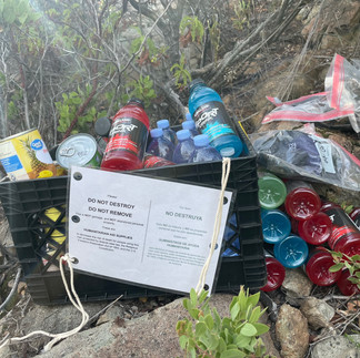 A second spot appears to us, a crossroads of sorts where thick roots and stumps twine together to create a sheltered place. A volunteer gets to work filling up a large, plastic crate with supplies, and all of us quickly follow suit. The weight on my back gets lighter and lighter with everything I pull out; bright red and blue Powerade, cans of pineapple suspended in juice, Vienna sausages in tiny blue tins. Once three black crates have been filled, signs are affixed to each, each reading in bold letters: